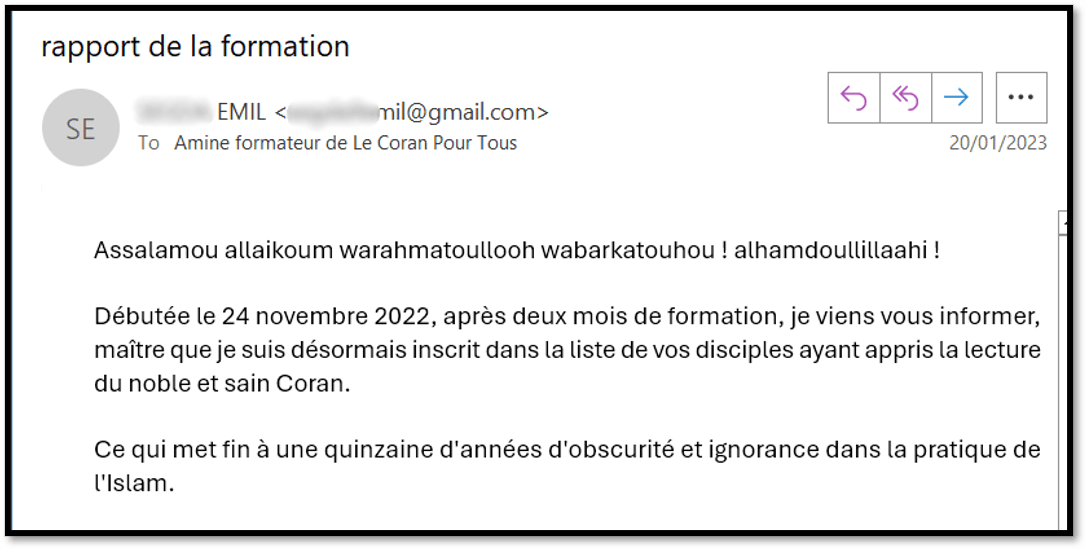 "... Concernant la formation MachaALLAH je ne peux que remercier Dieu de m'avoir permis de suivre vos cours en ligne.